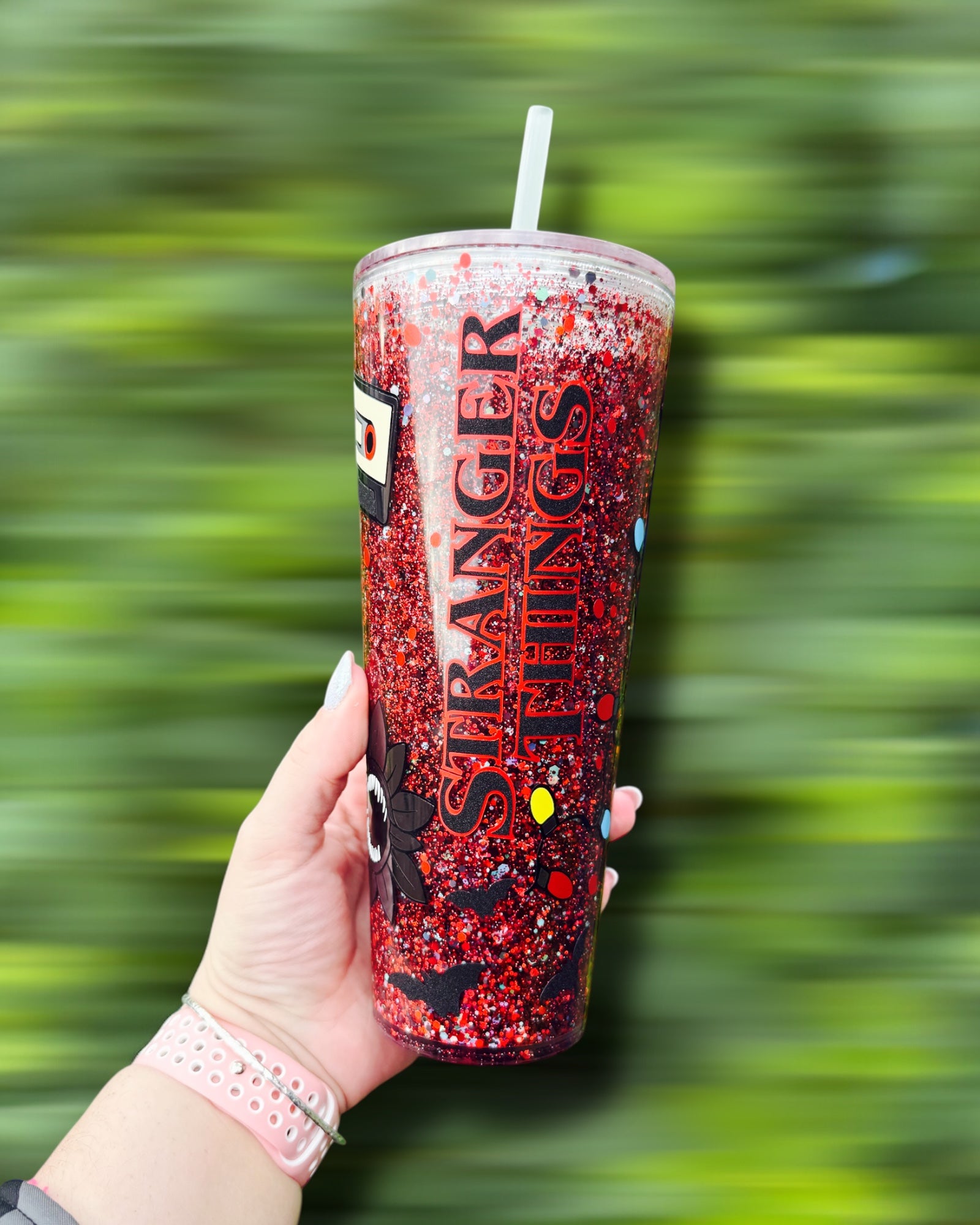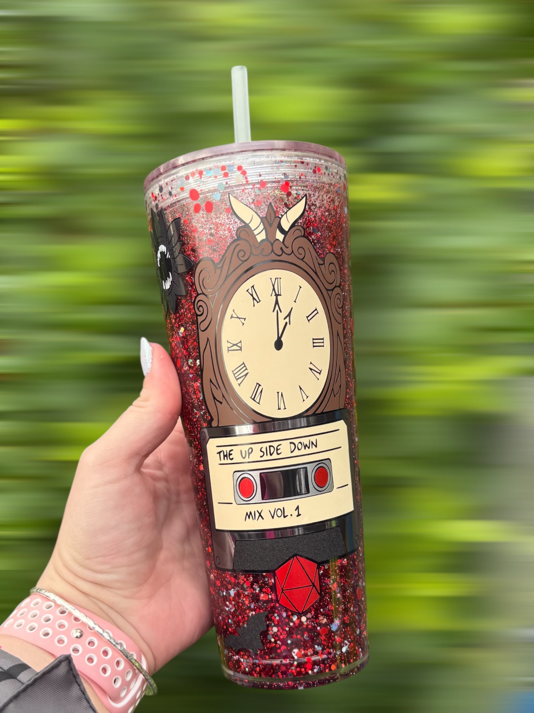 Things might get a little… strange when you shake this cup. The red and black sparkle mix creates a swirling storm like a portal to another dimension. Look closely and you’ll spot details inspired by creepy vines, mysterious clocks striking midnight, and a cassette tape that looks perfect for a life-saving playlist 🎧❤️